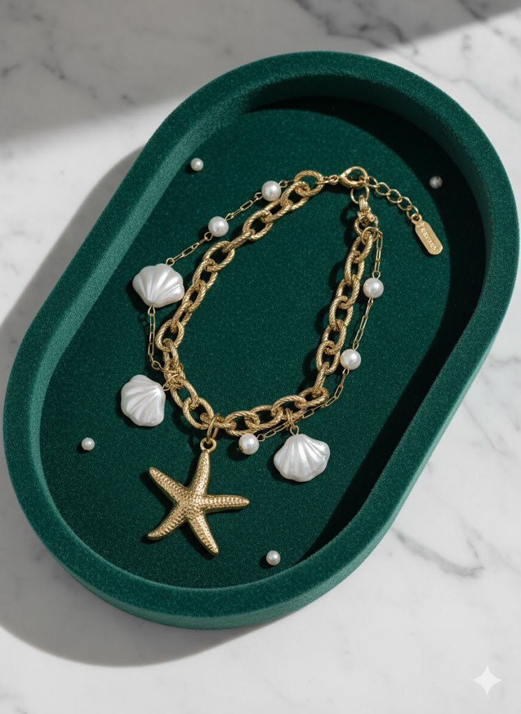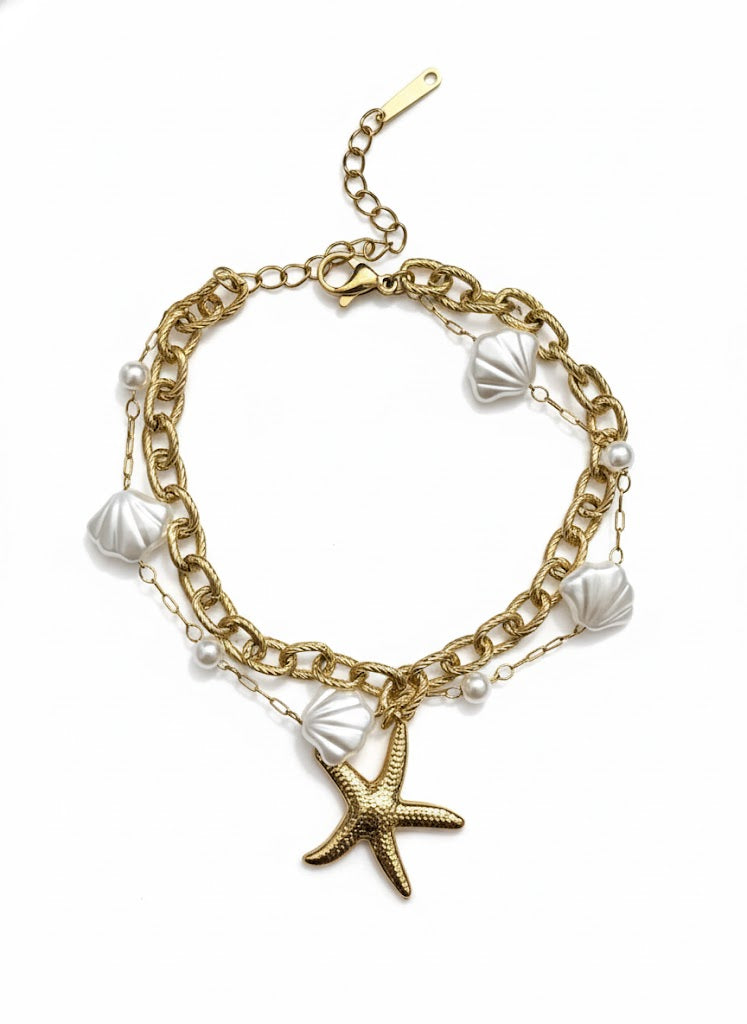 Expertly crafted with a striking combination of sea-inspired elements, the Shell Struck Chain Bracelet is a must-have accessory for any ocean lover. The delicate star and shell charms add a touch of whimsy, while the elegant chain design exudes understated beauty. Perfect for any occasion, this bracelet is both pretty and versatile.